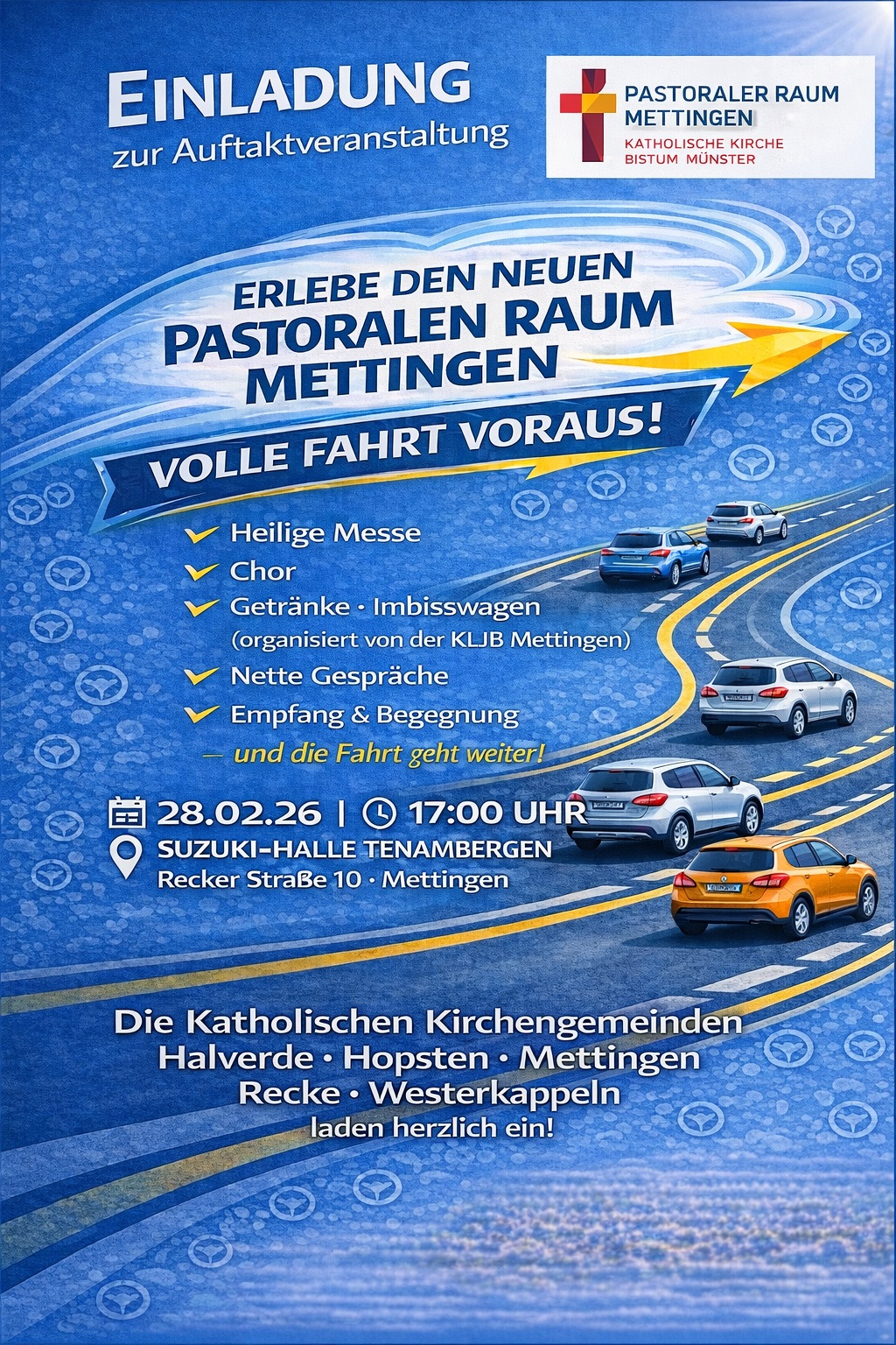 Herzliche Einladung zur Auftaktveranstaltung des Pastoralen Raums Mettingen am 28. Februar 2026 um 17 Uhr in der Suzuki-Halle Tenambergen, Recker Straße 10, Mettingen.