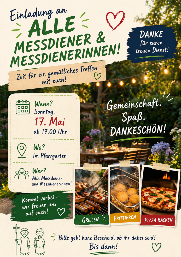 Die Leiterrunde und Pastor van Briel möchten sich bei allen Messdienern und Messdienerinnen für ihren treuen Dienst bedanken und laden deshalb zu einem gemütlichen Abendessen in den Pfarrgarten ein. Für Essen (vom Grill, aus der Friteuse und dem Pizzaofen) und Getränke ist gesorgt; der Pfarrgarten steht für Spiele aller Art offen.